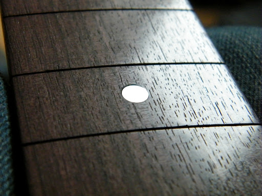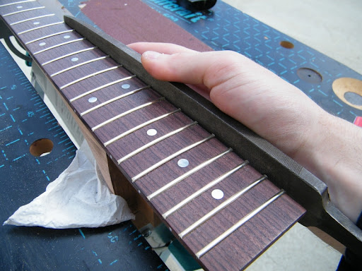 Quant au frettage il est tout frais de ce matin, j'ai fait pas mal de photo pour bien illustrer cette étape essentielle pour la jouabilité de la guitare et qui n'est pas si difficile que ça tout compte fait (enfin c'est la 8ème touche que je frette j'ai compris comment ça marche :mrgreen: )