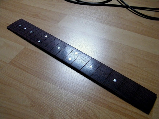 Il restera à mettre à niveau les frettes et à passer un coup d'abrasif fin (600) sur le bord de touche pour fignoler tout ça. Mais ce sera plus tard il s'est mis à pleuvoir... :|