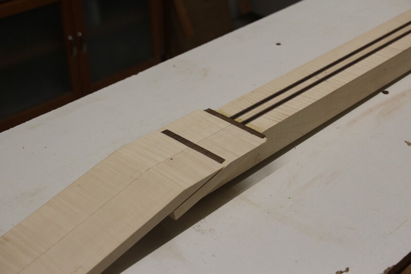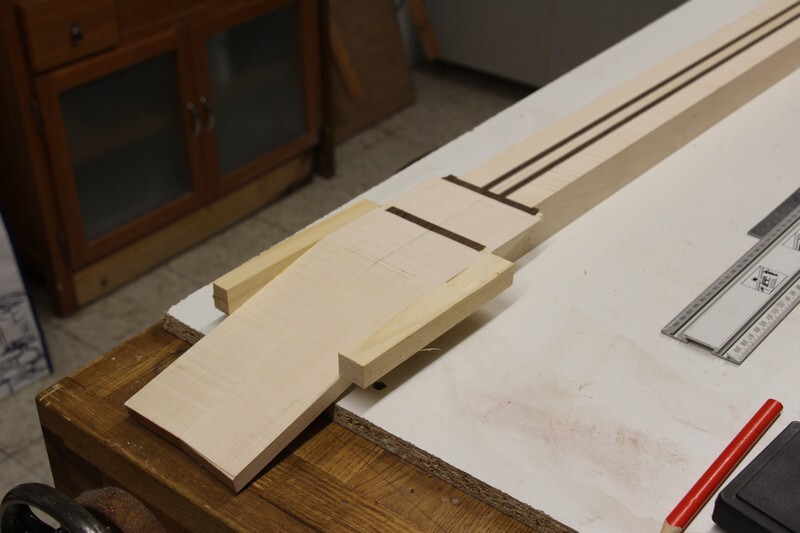 La touche sera en palissandre avec un filet érable-palissandre. Pour rappeler le filet sur le côté de la touche, je vais ajouter des placages d'érable et de wengé entre le manche et la touche pour faire un fin filet noir et blanc.
