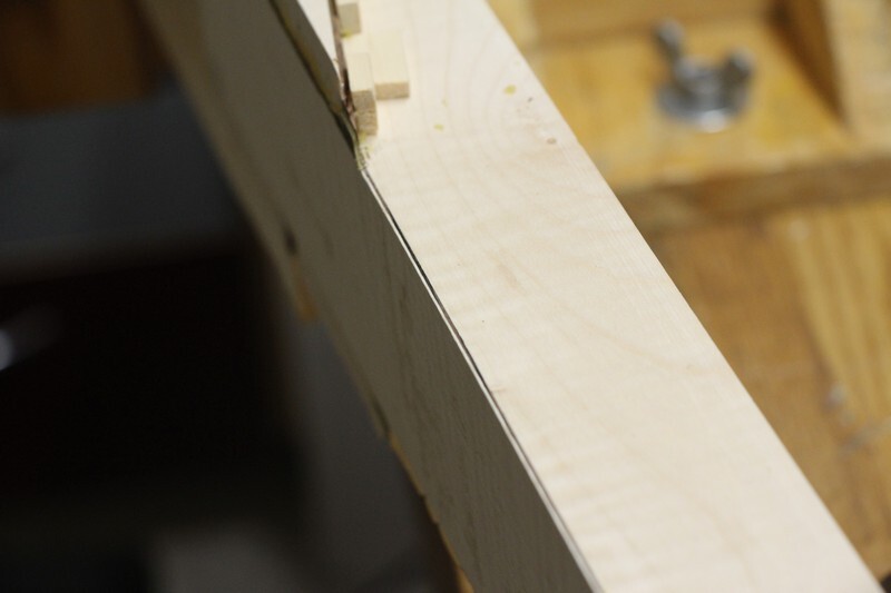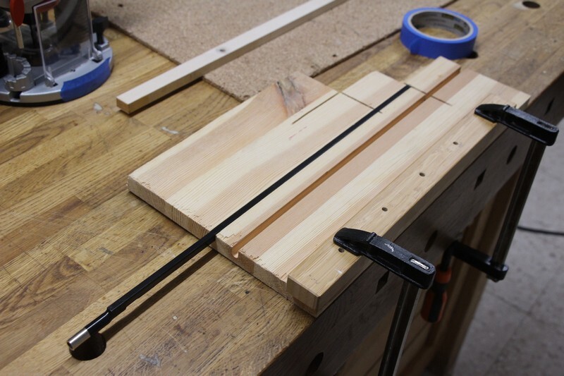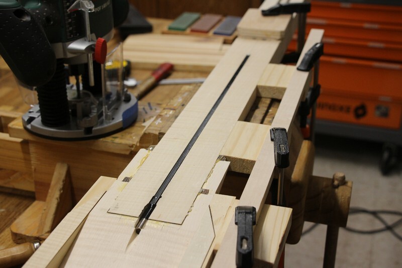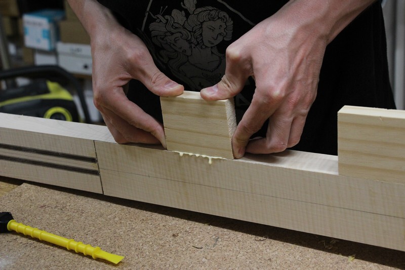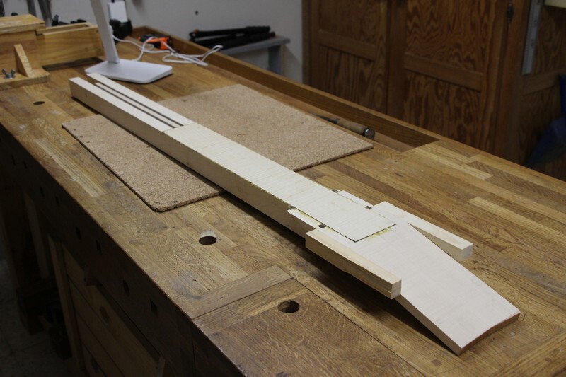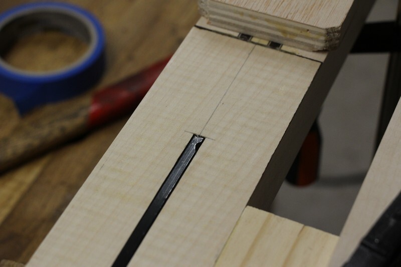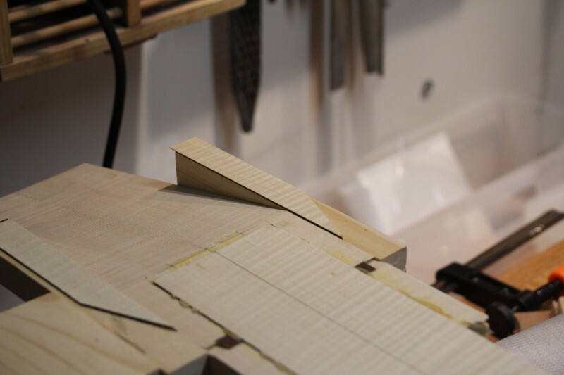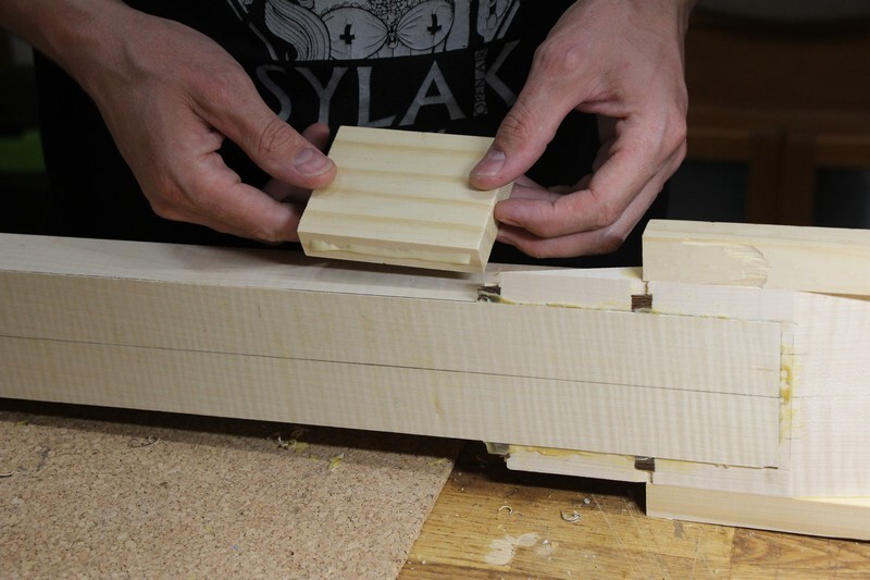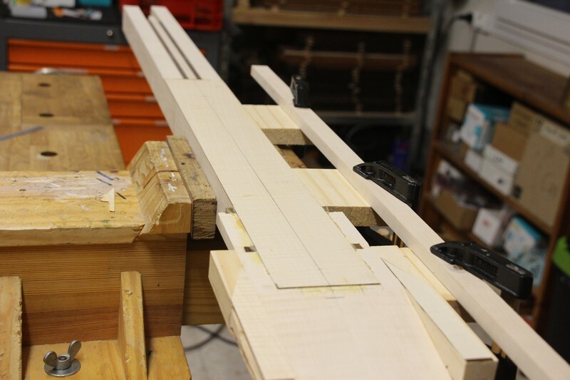 Sur l'un des côtés du manche, je colle quelques cales en pin qui serviront à fixer le guide pour faire la rainure du truss :