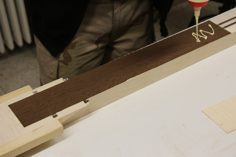 En premier, je colle le placage de wengé sur le manche. On met de la colle sur le manche :