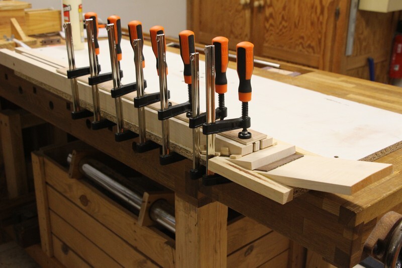 On met tout ça sous serre-joints, les placage en appui sur du mélaminé :